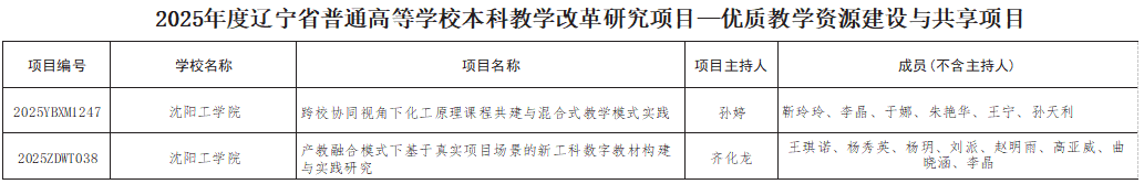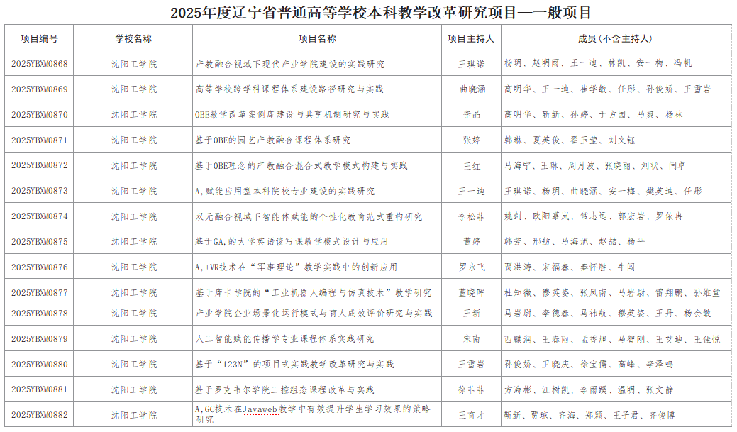 19日,根据辽宁省教育厅《关于确定2025年度辽宁省普通高等教育本科教学改革研究项目立项的通知》(辽教通〔2026〕67号)文件内容,我校申报的省级教育教学改革研究项目喜获丰收,王琪诺主持的“产教融合视域下现代产业学院建设的实践研究”等18个项目成功获批。其中,一般项目15项、优质教学资源建设与共享项目2项、中国国际大学生创新大赛优秀成果专项1项,立项成果覆盖多类型、多领域,充分彰显了我校在教育教学改革研究与实践探索中的坚实实力和显著成效。